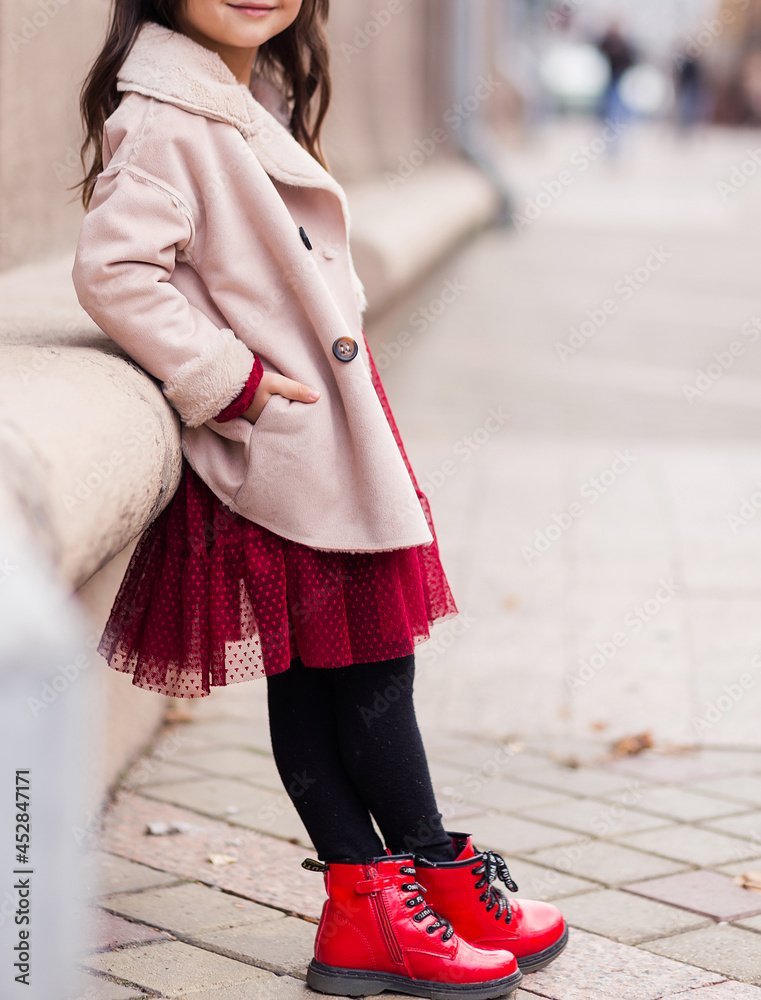 Stylish girl in a coat, red dress and boots posing on a city street