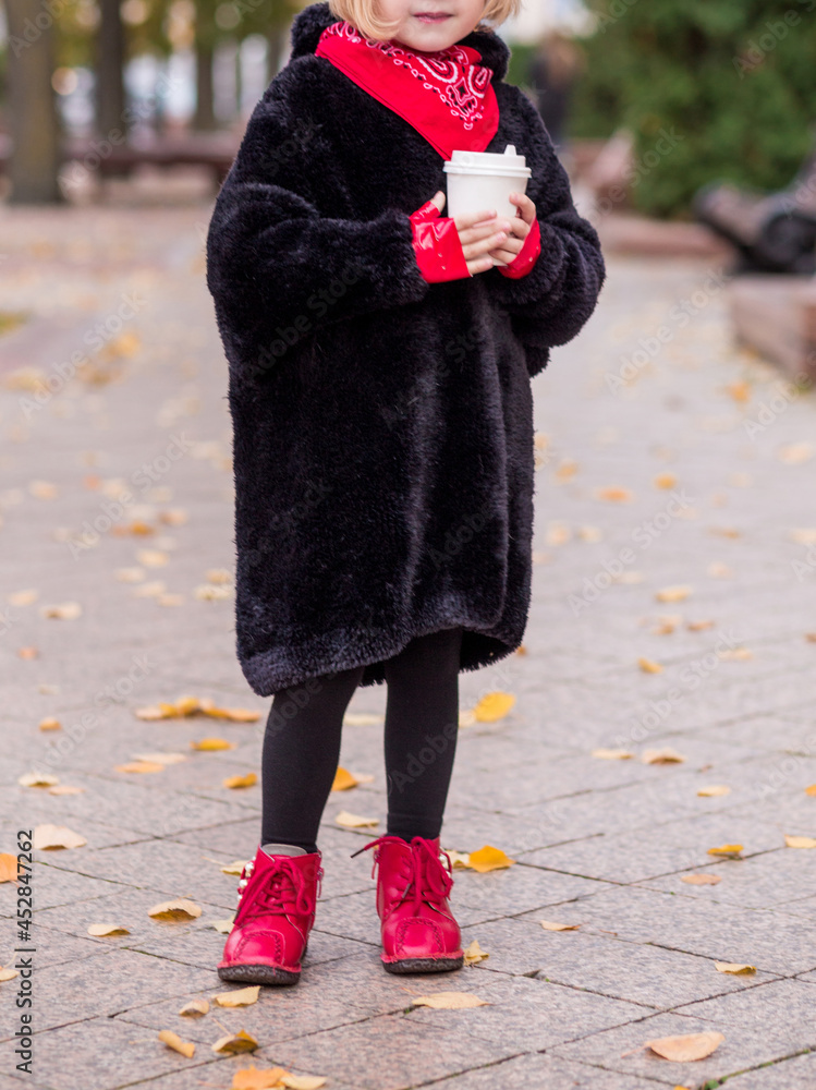 A girl in a black coat, a red scarf and boots posing on a city street in autumn weather with a glass of hot chocolate in her hands