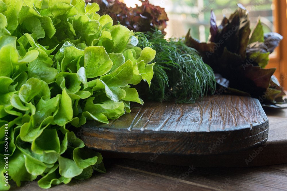 Fresh green lettuce leaves. Luscious greens for lunch. Healthy nutrition concept.