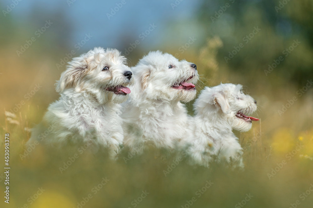 Białe szczeniaki siedzące w trawie na łące