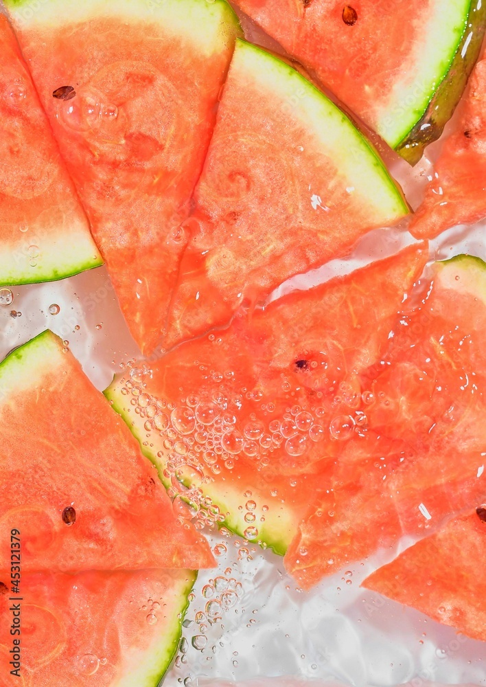 Close up view of the red melon slices in lemonade background. Texture of cooling sweet summer's drink with macro bubbles on the glass wall. Flat design