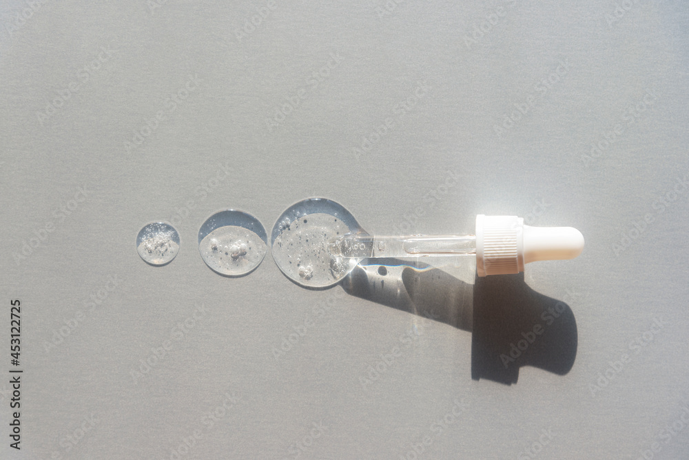 Three drops of hyaluronic acid and pipette on light gray background in sunlight. Top view, flat lay
