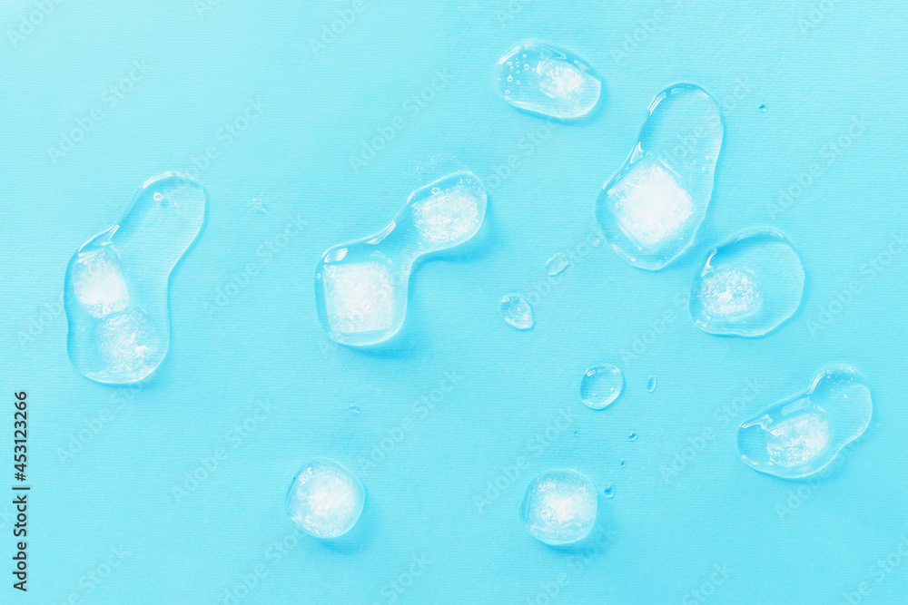 Melting ice cubes scattered on a blue background, top view. Texture