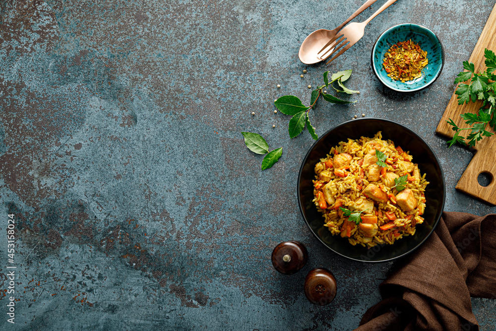 Pilaf or pilau with chicken, traditional uzbek hot dish of boiled rice, chicken meat, vegetables and spices on plate, top view.