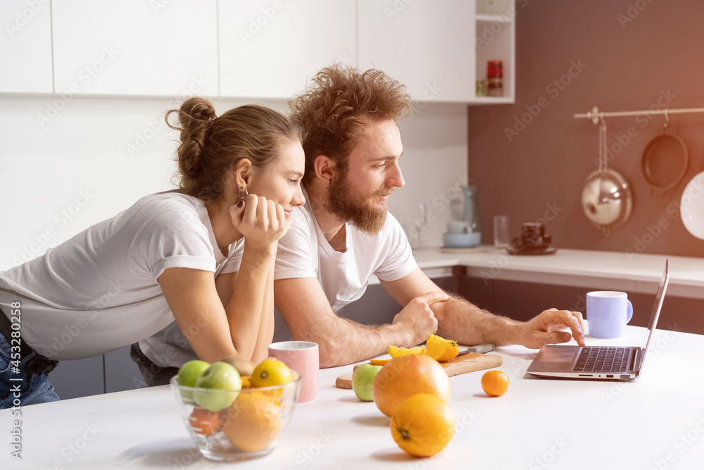 Leaned on kitchen table couple watching romantic movie or streaming social media video. Beautiful young couple talking on video call using laptop. Young couple in kitchen at new home.