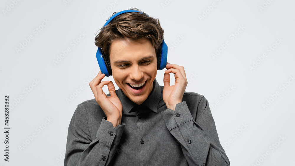 Joyful guy in grey shirt listening music wearing blue wireless headphones enjoying sound with closed eyes. Happy young guy listen to his favourite track or song.