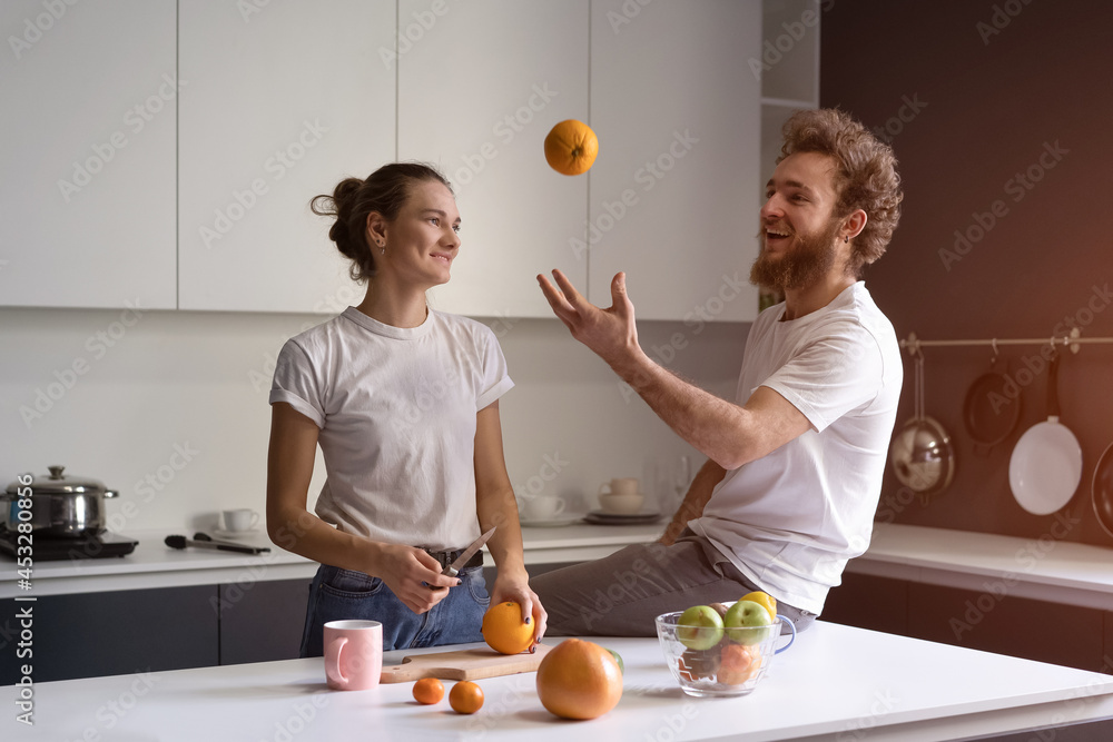 Playing with orange young man happy of their new home young couple cooking in new kitchen. Beautiful young couple talking enjoying their new house. New home concept.