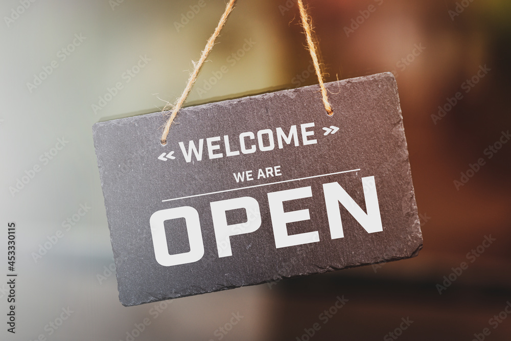 Modern, door sign we are open, after COVID 19.
