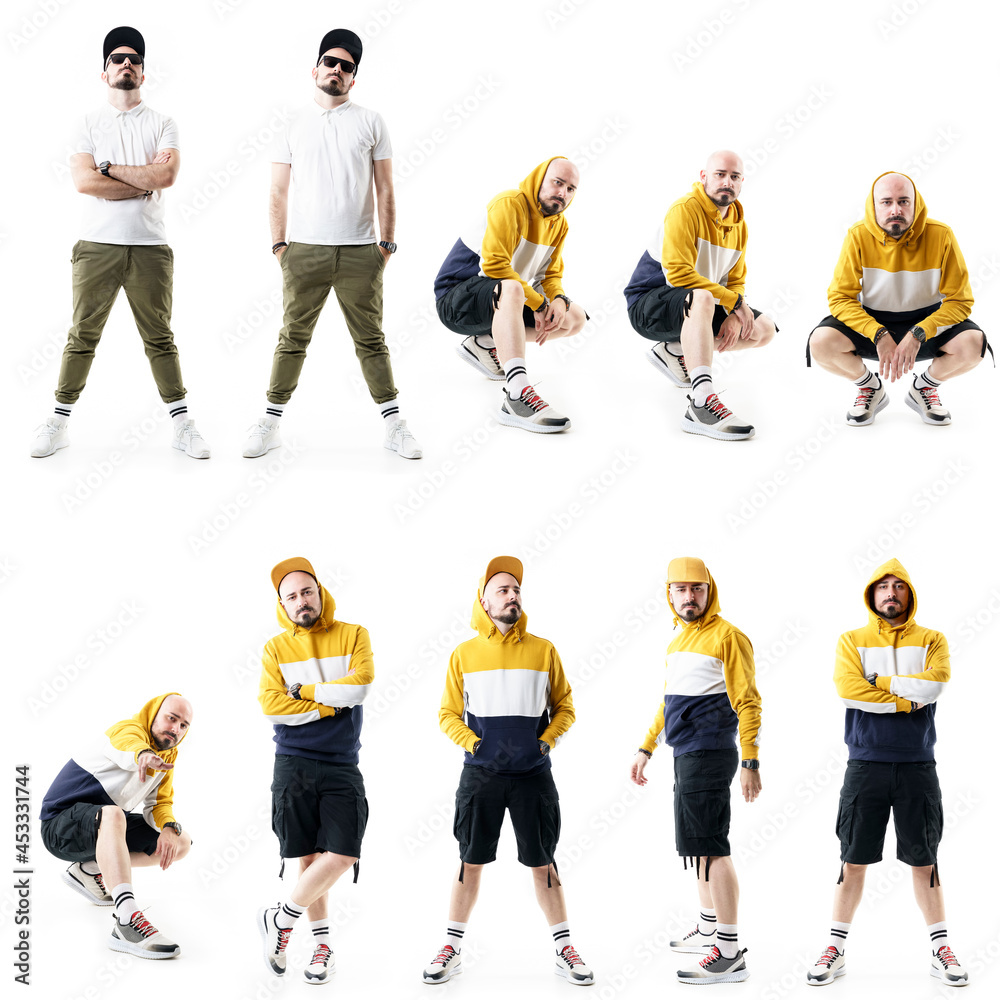 Collage of young males posing in nerdy and hip hop style clothes with rebellious attitude. Full length people isolated on white background