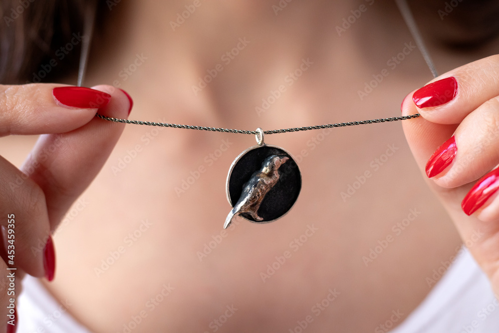 Woman is holding a silver necklace with a raven motif. Beauty and accessories, close up beautiful girl with stylish jewelry.