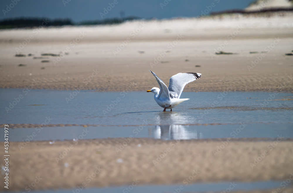 The photo shows a seagull on a North Sea beach
