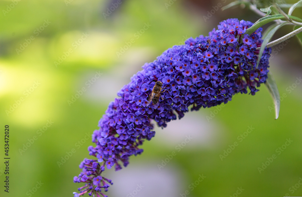 Image shows a bee on a purple Licac flower