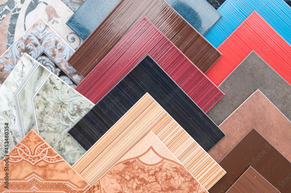 Samples of a colorful ceramic tile in store close