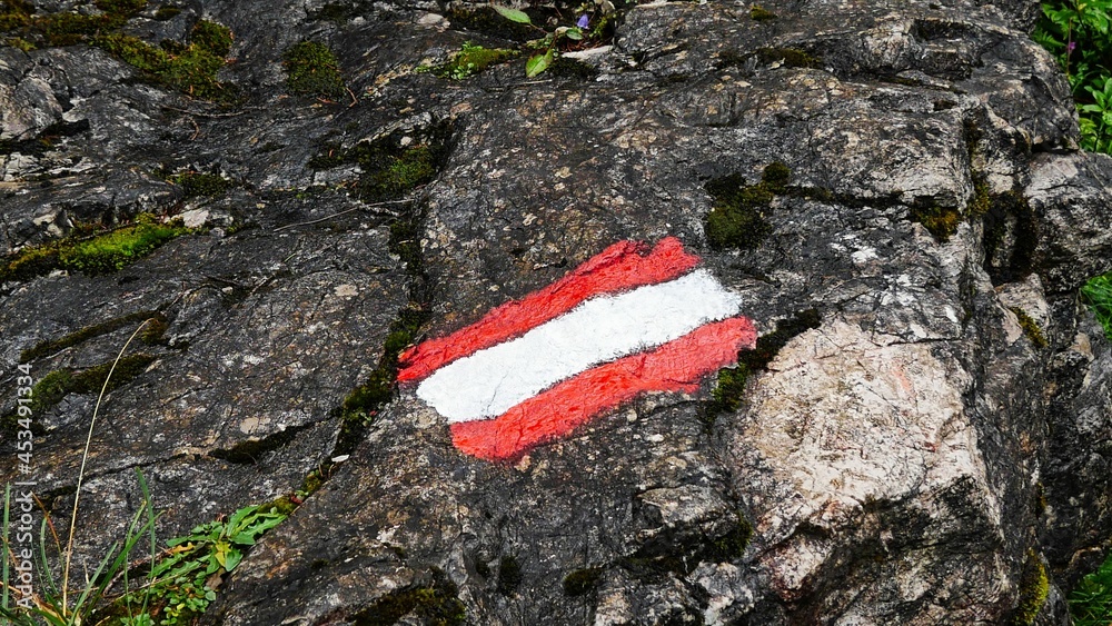 In den österreichischen Alpen markiert die Flagge Österreichs, auf Stein gemalt, den Wanderweg