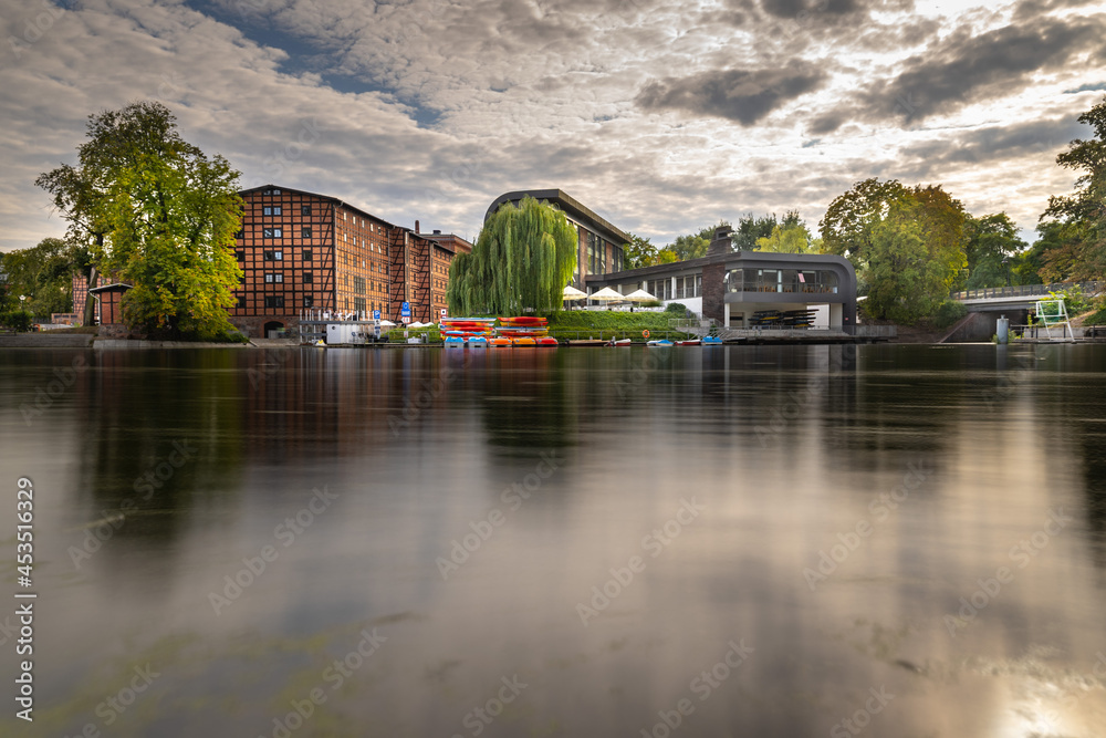 Brda river in the center of Bydgoszcz. Mill Island. August 2021.