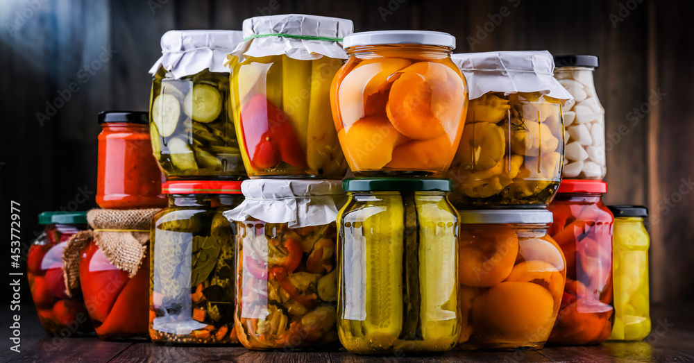 Jars with variety of marinated vegetables and fruits