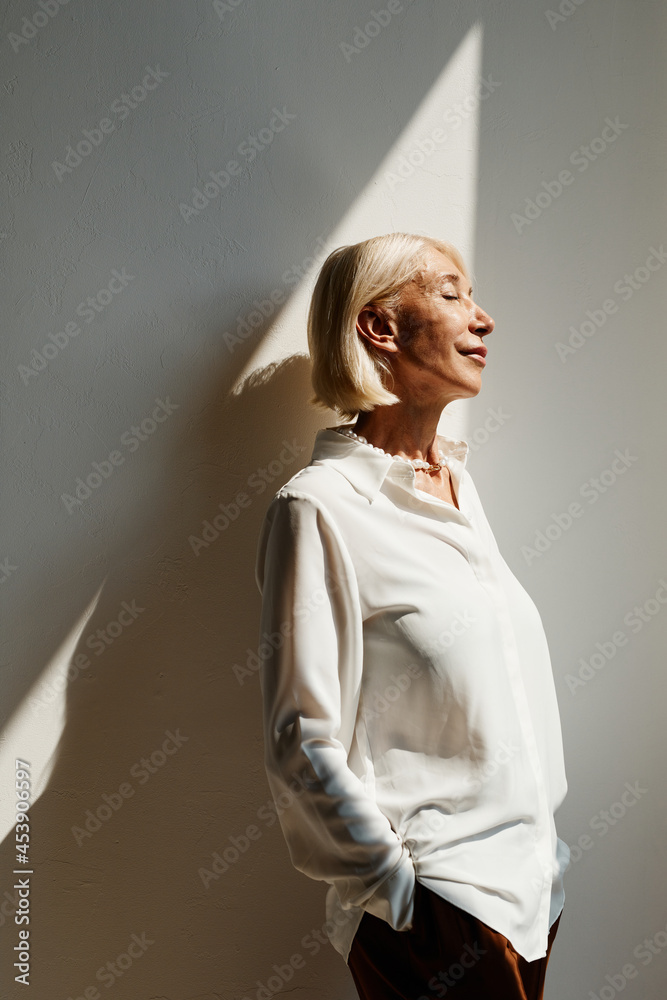 Vertical side view portrait of elegant mature woman lit by sunlight against white wall, copy space