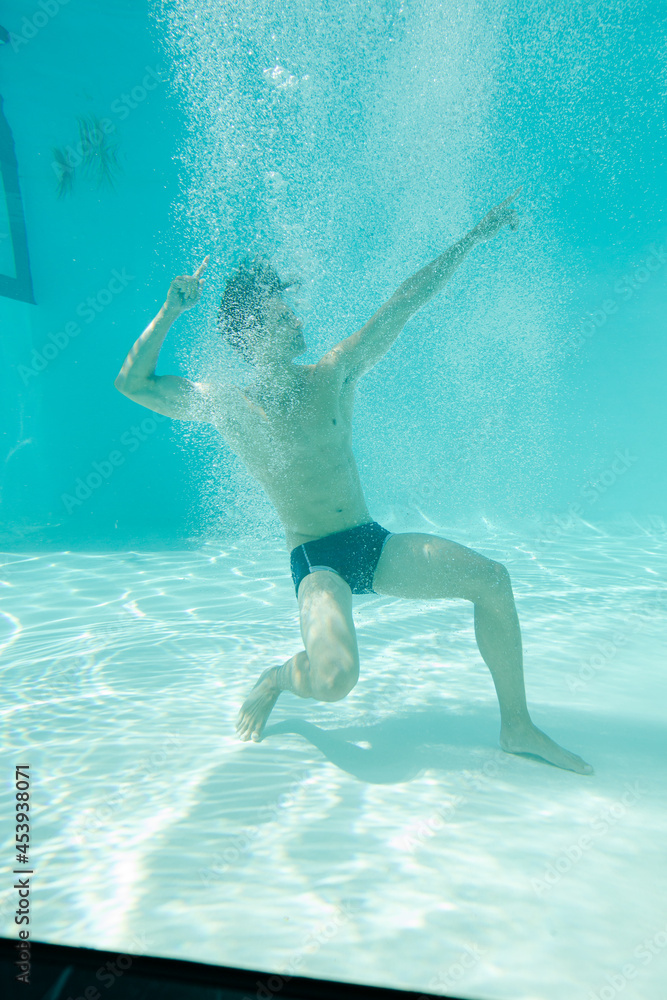 Man posing underwater in swimming pool