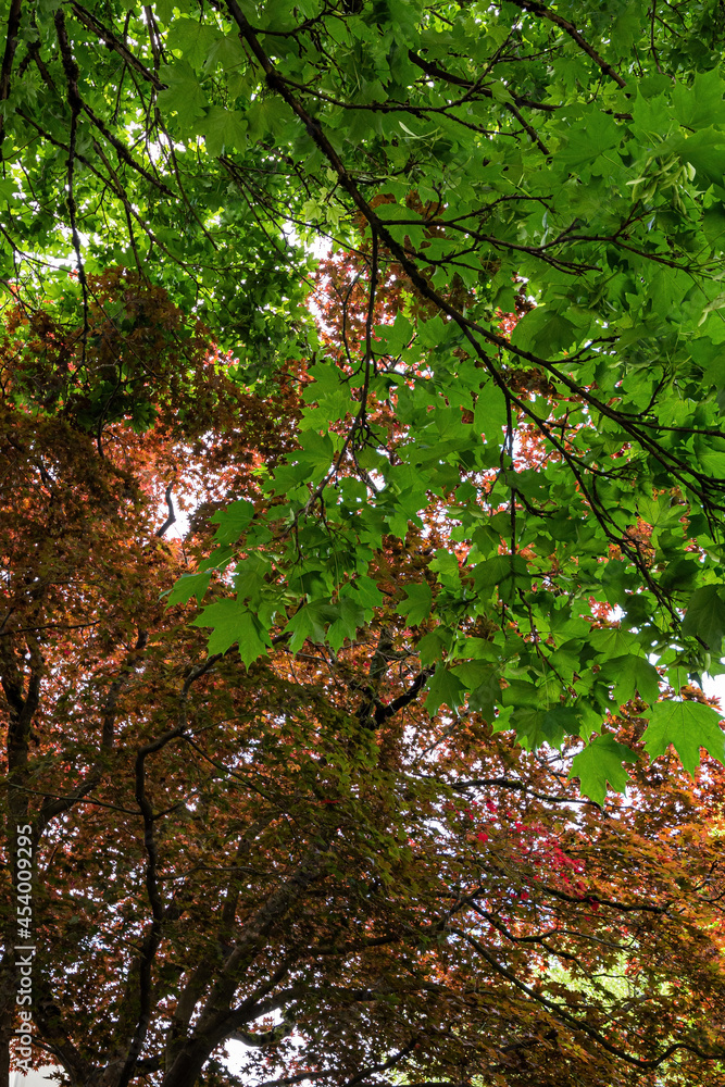mix up of orange and green foliage on top of the trees under the sky background