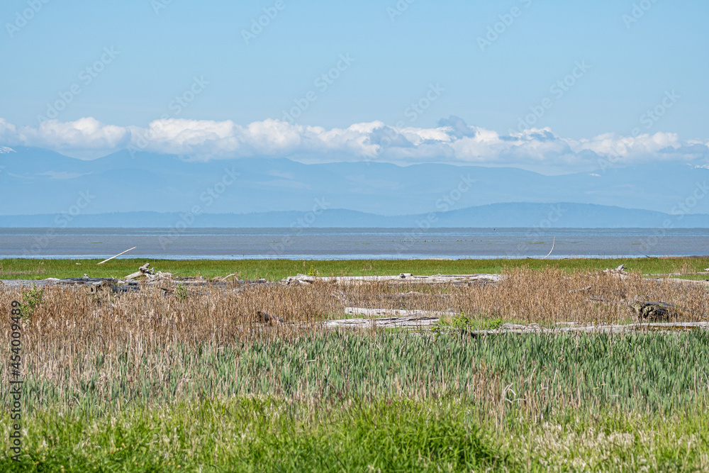 vast wetland by the coast with cloud covered mountain range over the horizon under blue sky