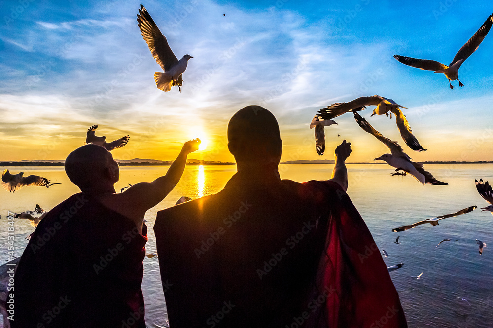 Myanmar. Mawlamyine (Moulmein). Monks giving seeds to seagulls