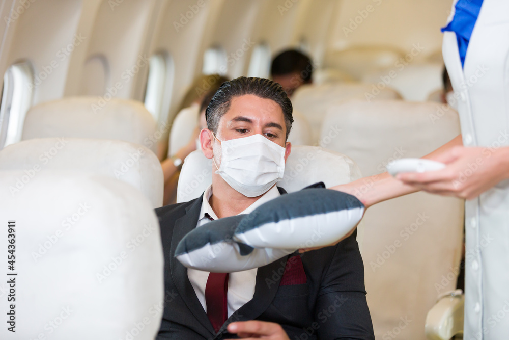 Flight attendant serving to passenger in an airplane and passenger wearing face mask while sitting on seat