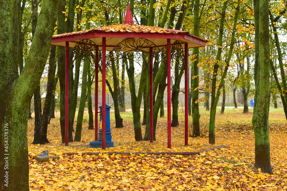 Autumn. City Park. Gazebo in the park and yellow leaves lying on the ground.