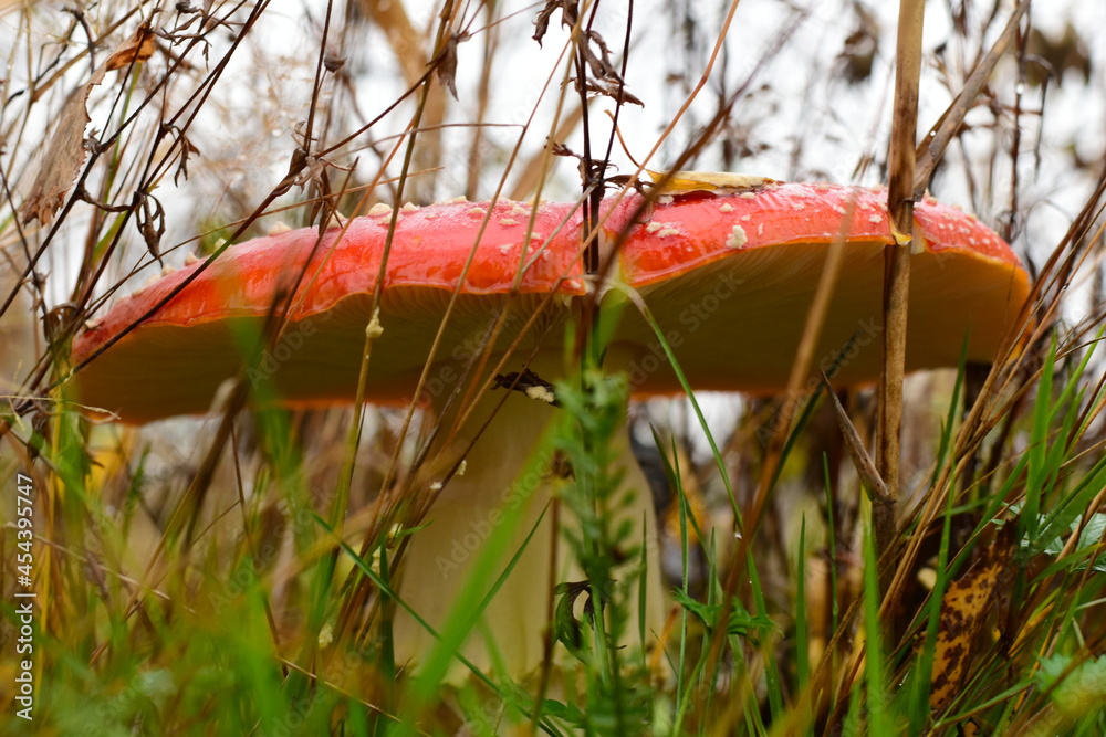 The picture shows a close-up of a fly agaric mushroom with a red hat, shot from the side in dense grass.