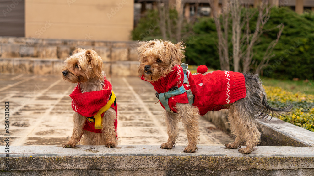 A mother and her son Yorkshire terrier, under observation, outdoors, in winter