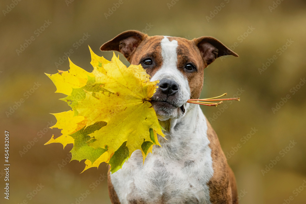 American staffordshire terrier dog holding yellow leaves in its mouth in autumn