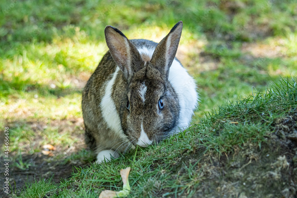 close up of a beautiful rabbit with blue eyes and mixed grey and white fur eating behind small grasses filled slope in the park