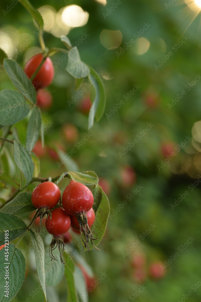 Red, ripe fruits of apple rosa Karpatia closeup, green background with bokeh lights and sunbeams.