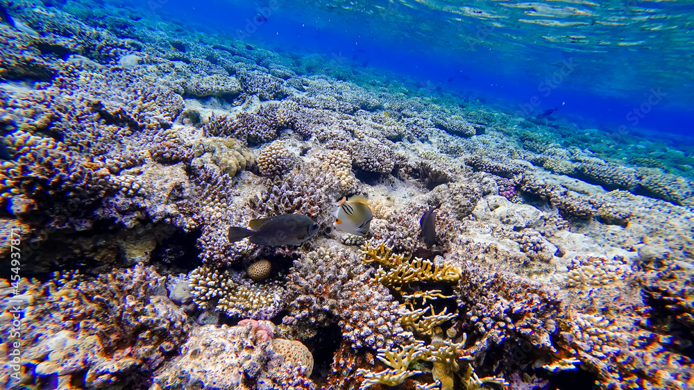 a beautiful white fish with red eyes swims near the coral of the red sea in search of food