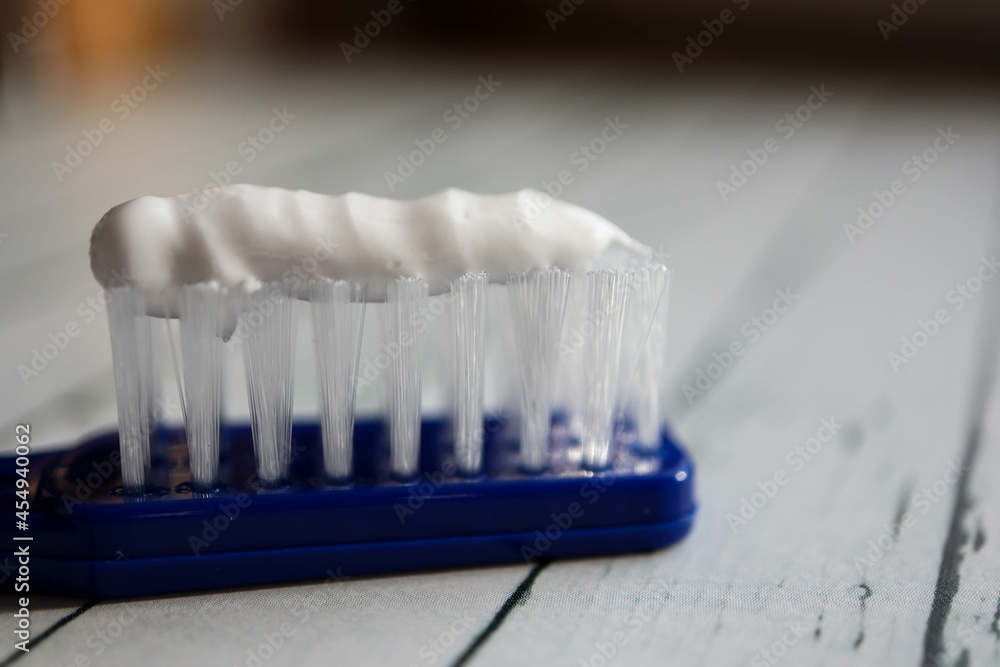 close up of colorful toothbrush with toothpaste close up macro on wooden table