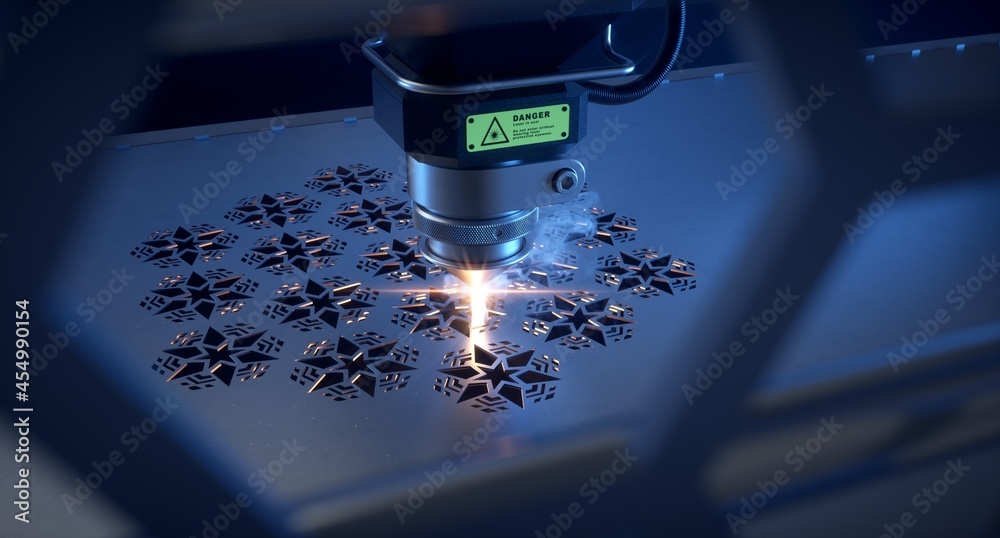 Laser cutter close up, cutting geometric patterns in a metal sheet.