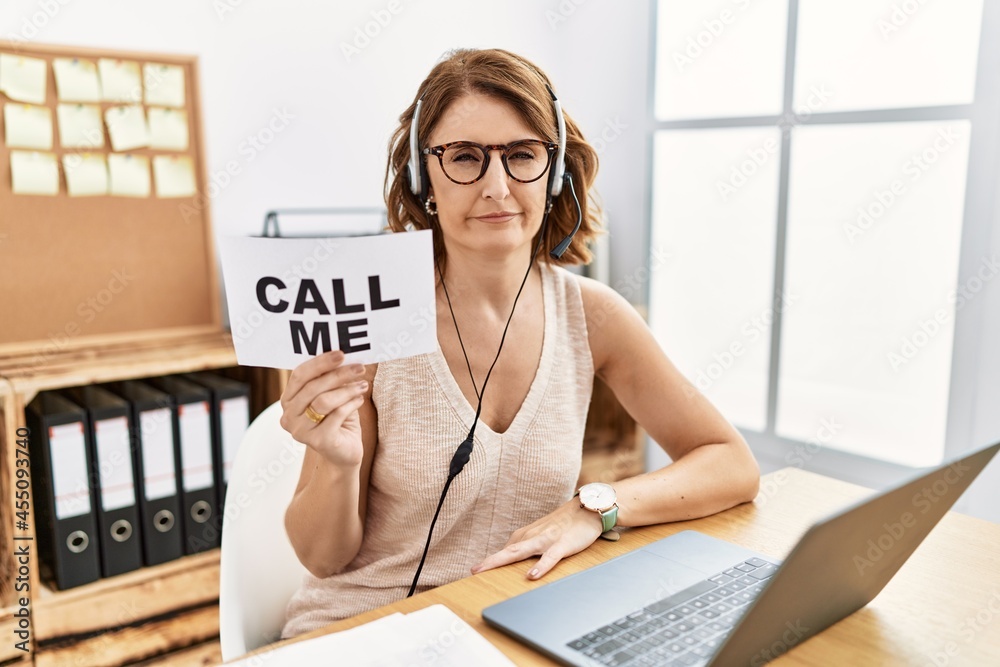 Middle age brunette woman wearing operator headset holding call me banner skeptic and nervous, frowning upset because of problem. negative person.