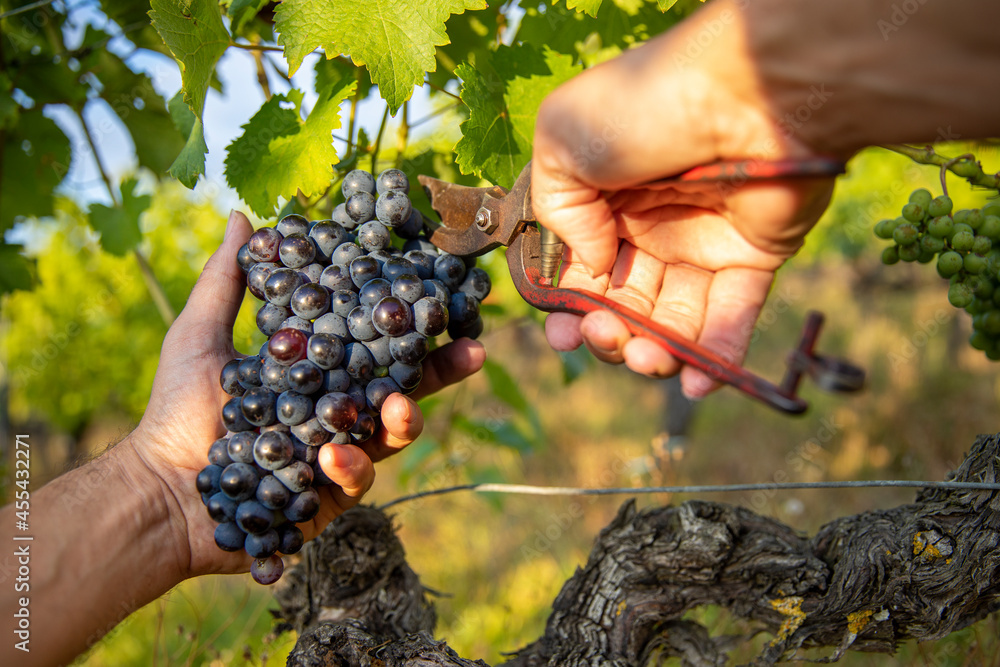 Récolte du raisin noir dans les vignes, gros plan sur les mains du viticulteur pendant les vendanges.