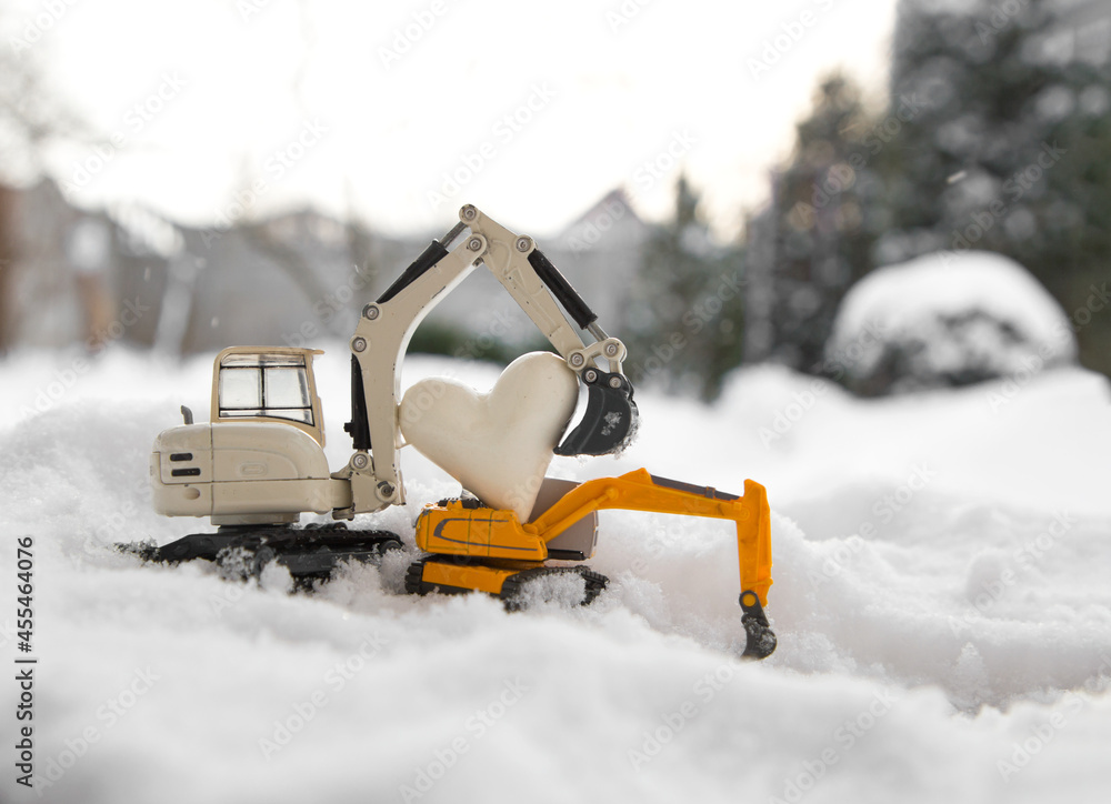 souvenir heart is kept by two models of toy excavators. business congratulations to construction companies on Valentine's Day.