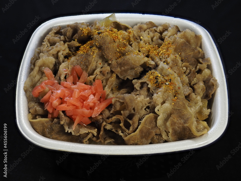 Tokyo,Japan - September 8, 2021: Closeup of beef bowl or gyudon in Styrofoam cup on black background