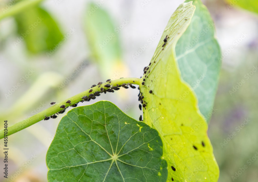 A herd of plant louse (aphid) on a green leaf