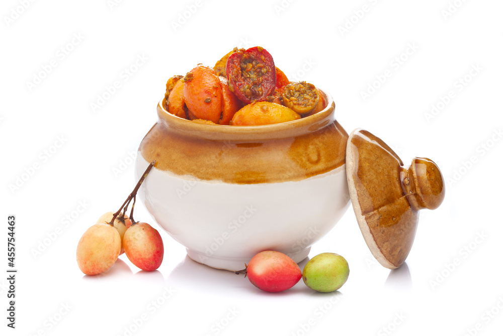 Close-up of Indian Organic pickle (Achar) made from carissa carandas ( karonda ). Very spicy, tart, acetic in taste and aromatic. A mixture of ayurvedic spices herbs with vegetables