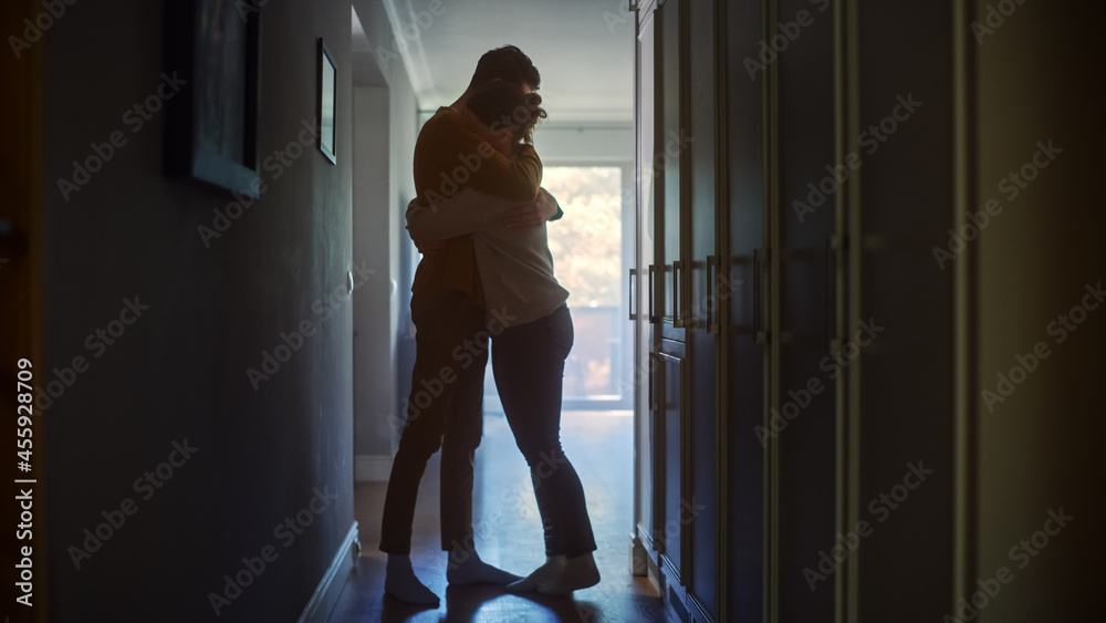 Sad Couple Embracing, Comforting Each other in Difficult Times. Family Overcoming Difficulties Together, Tender Moment. Atmosphere of Sadness and Tragedy. Moment of Human Drama