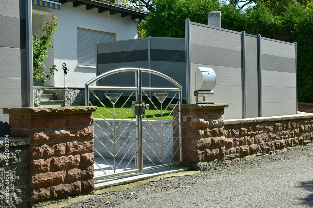 Natursteinmauer, Edelstahl-Gartentor und fest stehende Kunststoff-Sichtschutzwand und rot lackierter Holz-Lattenzaun als Einfriedung um den Garten eines Einfamilienhauses