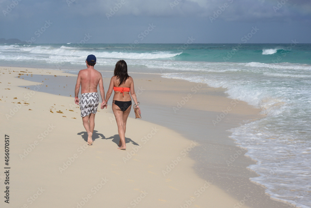 A man and a woman walk along the ocean shore holding hands. Paradise Island. Romantic trip.