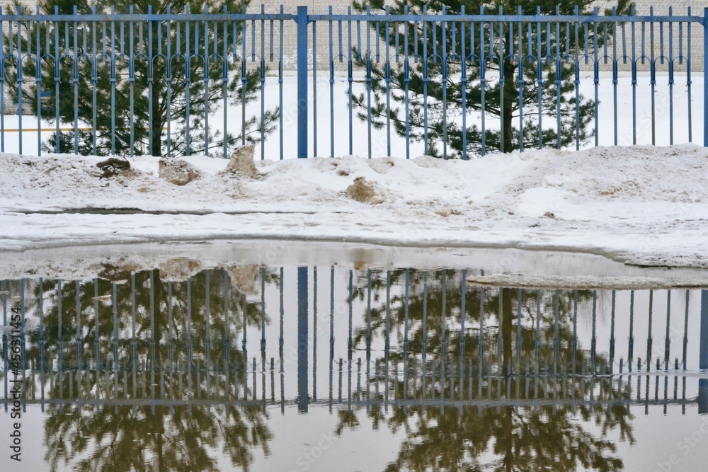 A road with melting snow, puddles and ice on a cloudy spring day. Reflections in cold water. Snow and mud. Thawed patches. Spring has come, the month of March.
