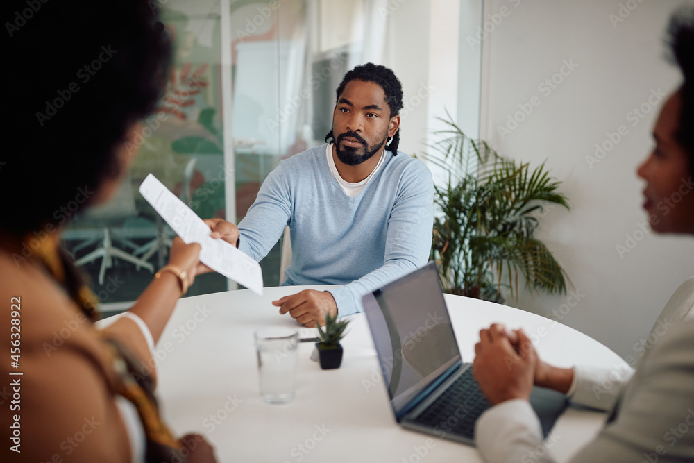 African American candidate gives his resume during job interview in the office.
