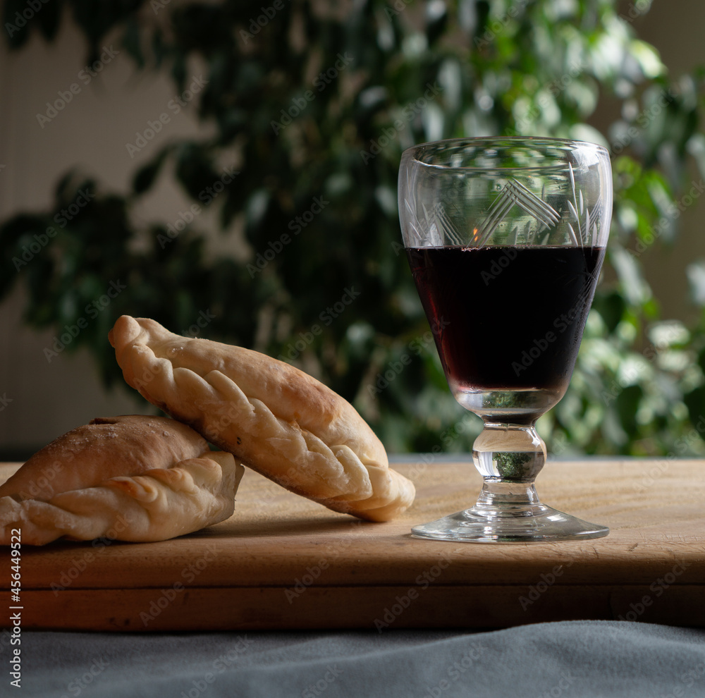 traditional Argentine food, an empanada or patty on a wooden board and a glass of wine by its side