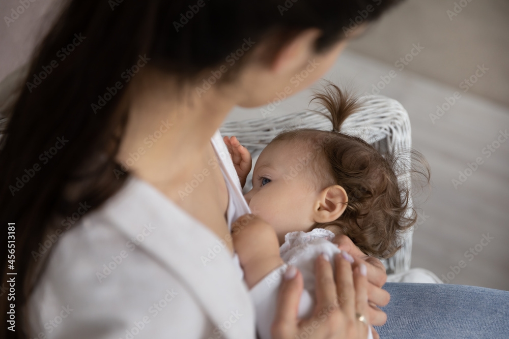 New mother breastfeeding adorable child, sitting, holding baby in arms. Young mom feeding cute infant milk from breast, caring for natural nutrition for healthy toddler growth. Motherhood concept
