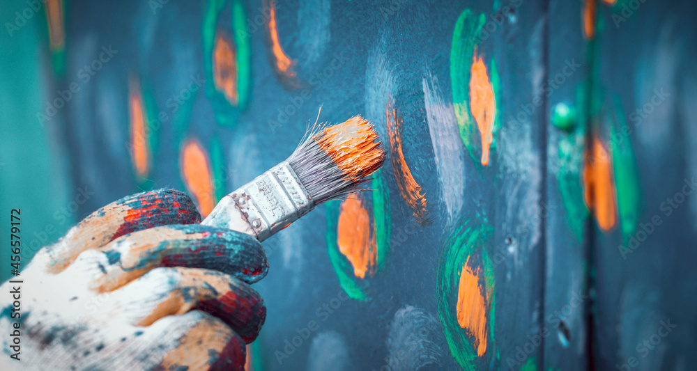 A hand holding a paint brush and painting a wall