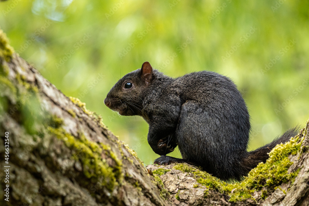 close up of a cute grey squirrel resting on the split of the tree trunk under the green foliage